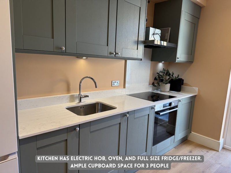 • Open-Plan Shared Kitchen & Dining Area: A beautiful, fully equipped kitchen with fridge/freezer, oven, and electric hob. Perfect for quick and easy meal prep or enjoying social dinners with housemates.