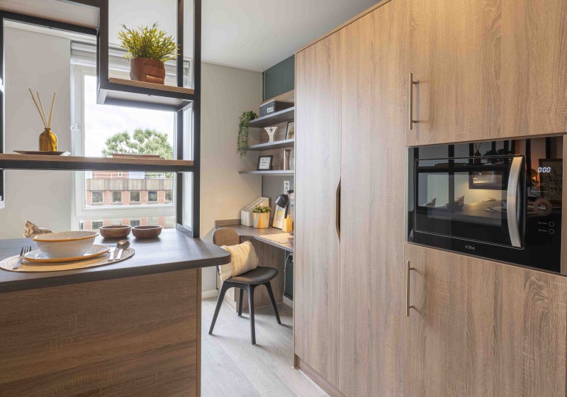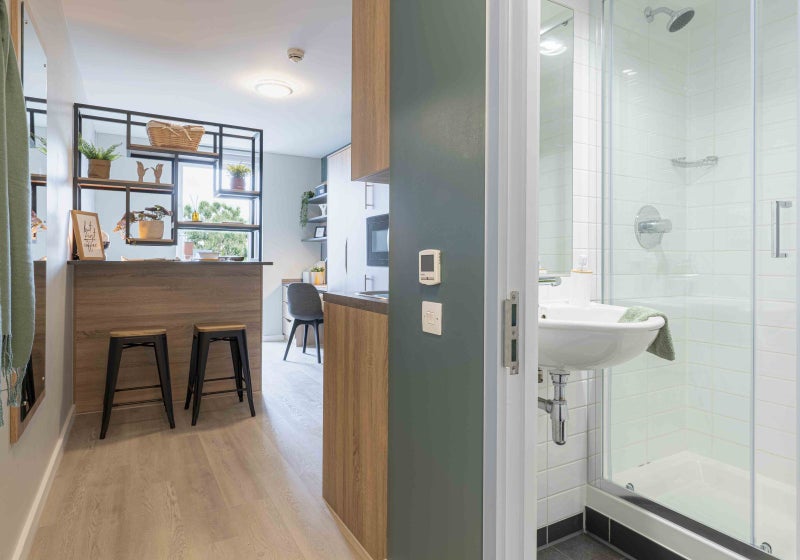 The Bronze Courtyard Studio Plus offers all the facilities you need in one of our building’s most peaceful locations. With a 17 sq m floor plan, and its own kitchen and shower room, it provides independent living in a good-sized space. You will also have access to all of our onsite facilities, including a free-to-use gym, cinema, fitness studio, private dining room and study lounges.