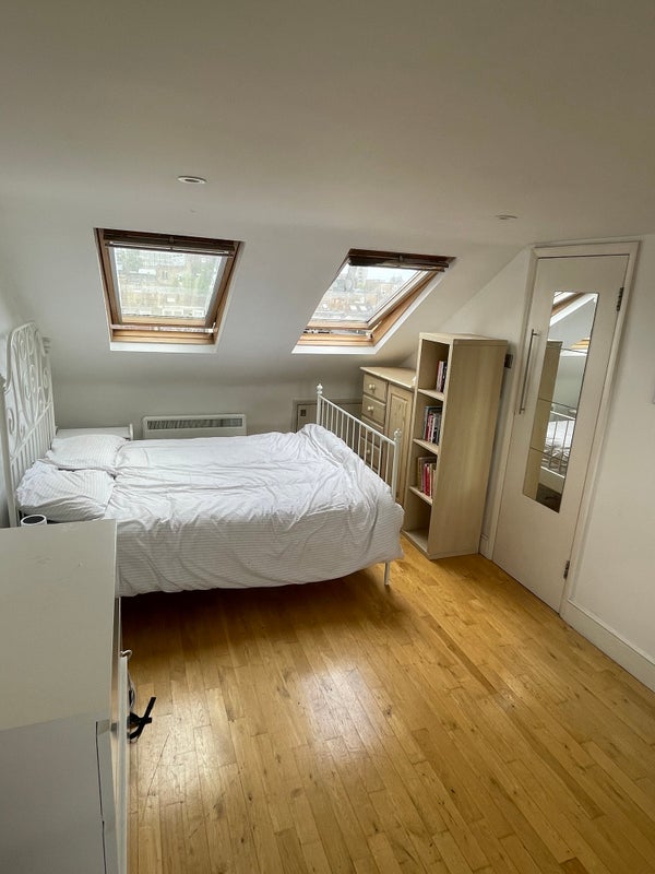 The room is on the top story of the house. You will have the entire floor to yourself, and it comes with an ensuite. It’s a really big room, incredibly private, lots of storage space, with large skylights and nice views. Room comes fully furnished with a bed, cupboard, desk and chair.