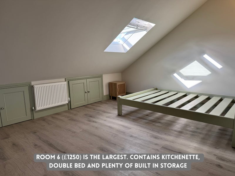 The attic room available is the largest bedroom in the house. It shares a large bathroom with Room 5, and the bathroom has its own washing machine for convenience. Strictly single occupancy only - no couples, and no regular overnight visitors due to the terms of our licence.
