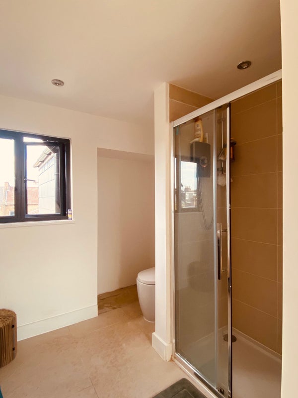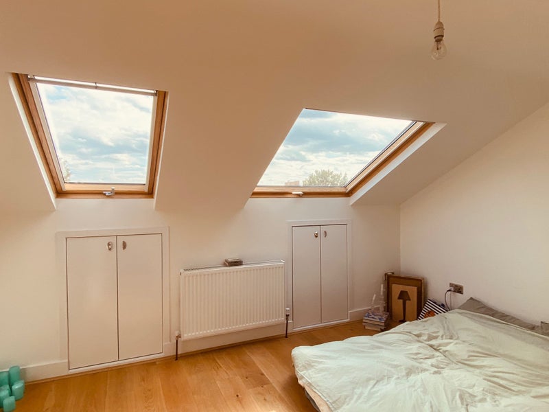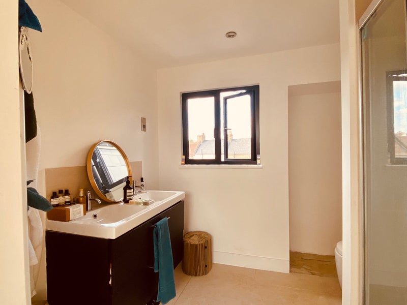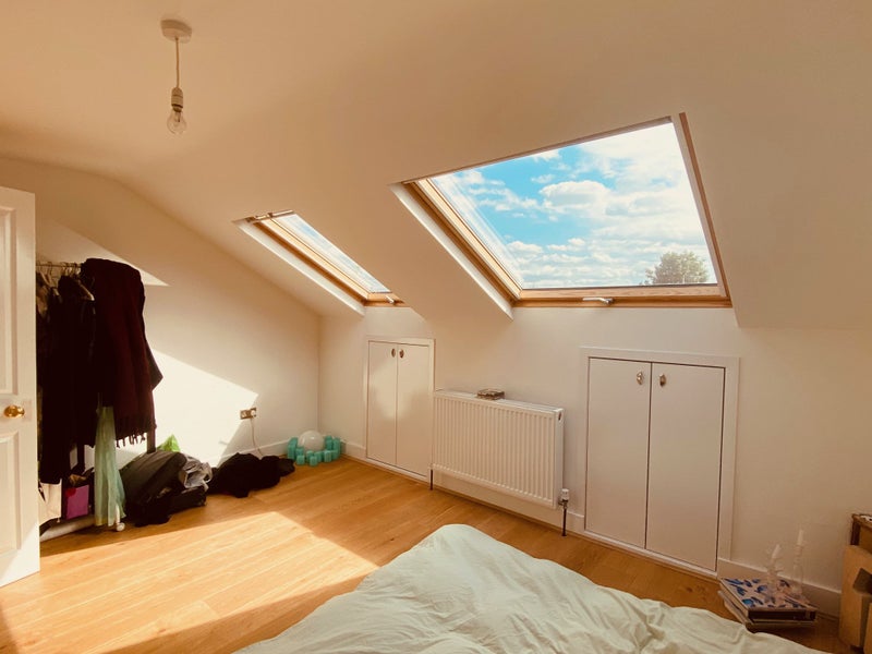 The bedroom is very bright, with two huge velux windows with black out blinds. The ensuite has a double sink and 1.2m wide shower.