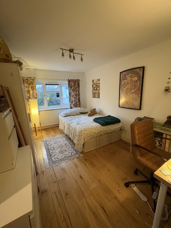 Large bedroom: 1 double bed, 2 chests of drawers, 1 wardrobe, 1 side table. Huge space, with more than enough room for a large desk. Windows face onto a garden.