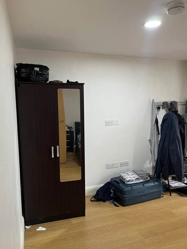 Spacious and comfortable with natural sunlight, it includes a wardrobe, jacket hanger, bedside table, bed.
