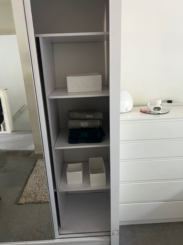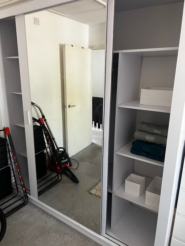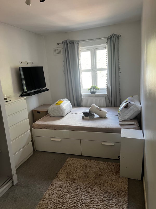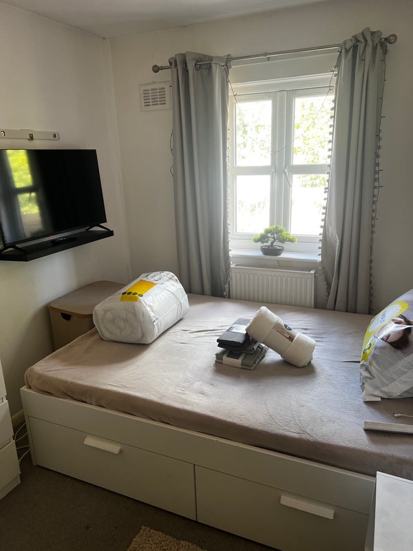 We have a stunning extra-large double room available. It’s bright, spacious, and fully furnished with a built-in wardrobe, chest of drawers, two mirrors, on the wardrobe, a smart TV, and a comfortable small king-sized bed.