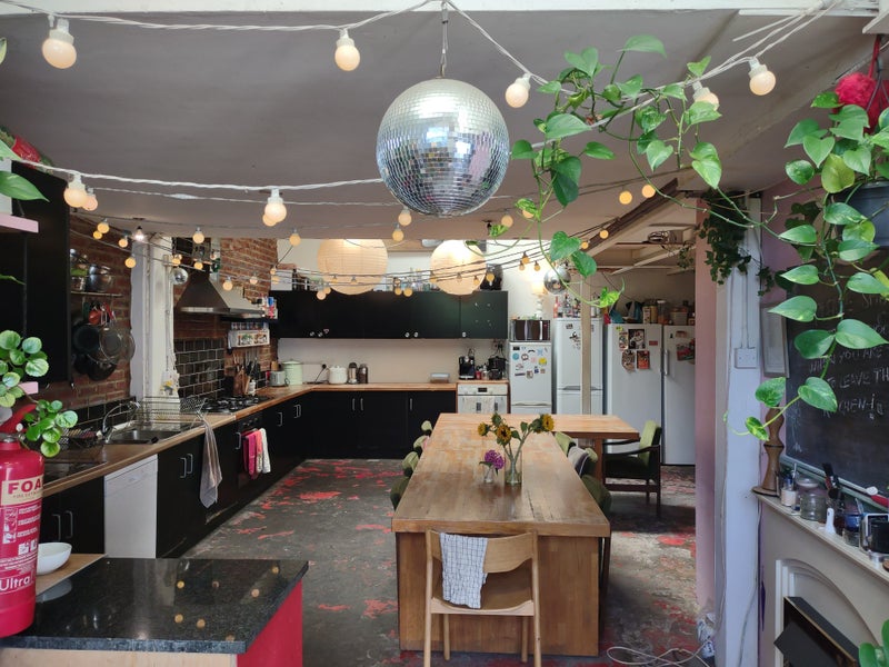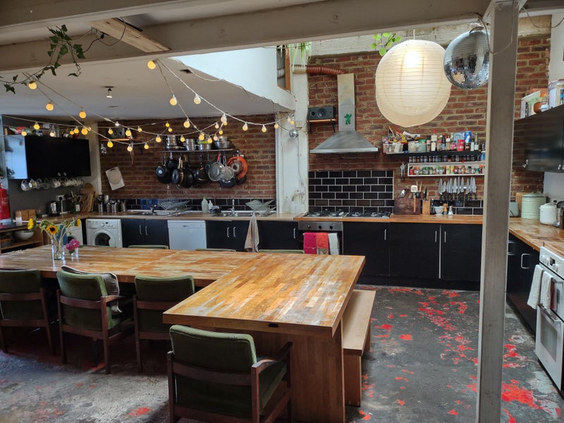 The rest of the house is large and open - there is a huge communal studio at the back of the house and a large kitchen which comes with all the mod cons (perfect for cooking and socialising).