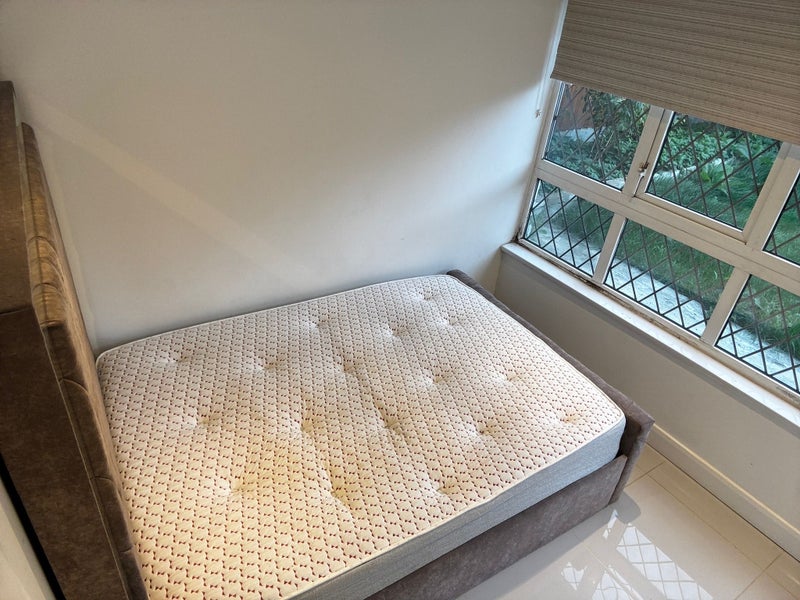 The whole flat is fully furnished, the bed is a double sized. It also comes with private shower, toilet and sink. As well as a fully equipped kitchen and dining table which can be used as a desk.