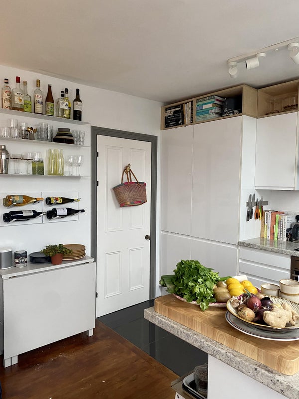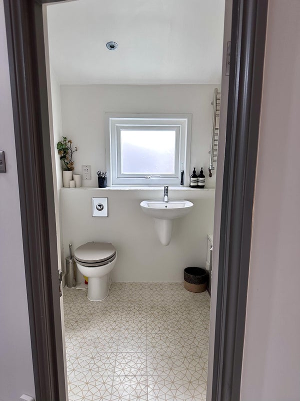 Shared kitchen/living room and bathroom.