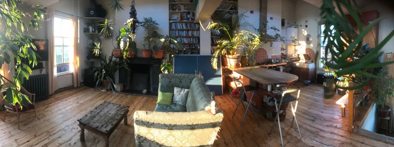 The flat has a huge open-plan living space with nine windows, lots of greenery and a calm creative feel, plus a small south-facing roof terrace.