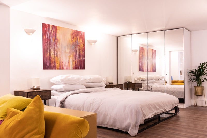 The large open plan living area opens on to an enclosed courtyard with outdoor furniture and plants, and features a raised double bedroom area with a wardrobe wall of mirrored glass.