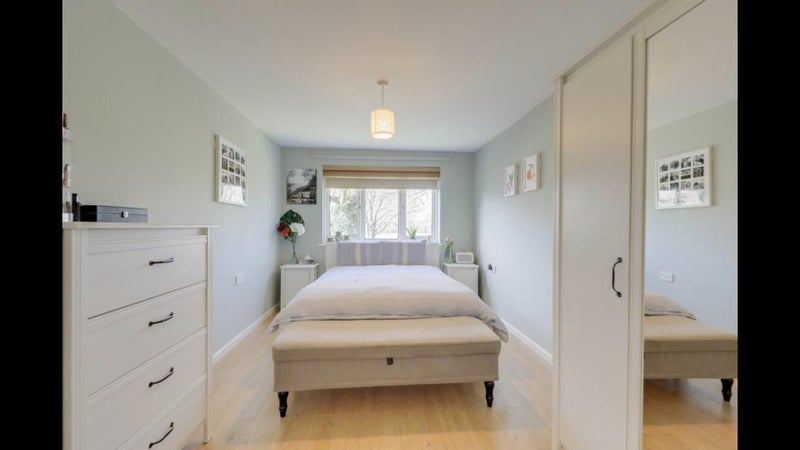 Bedroom includes double bed frame & mattress, desk, chair, wardrobe, and ottoman (with storage space).