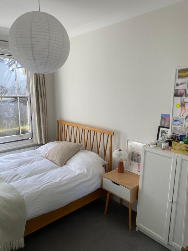 The room is unfurnished, so you would need to bring or acquire a bed frame, but my current flatmate is leaving behind a double mattress and chest of drawers, which you’re welcome to use.