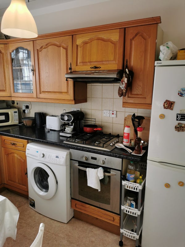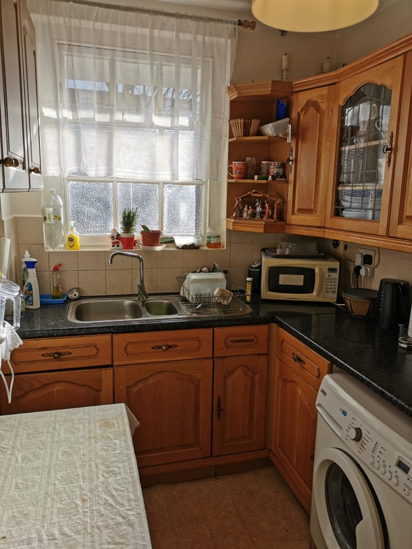 Flat comprising fully fitted kitchen with small table and appliances like washing machine, microwave and kettle.