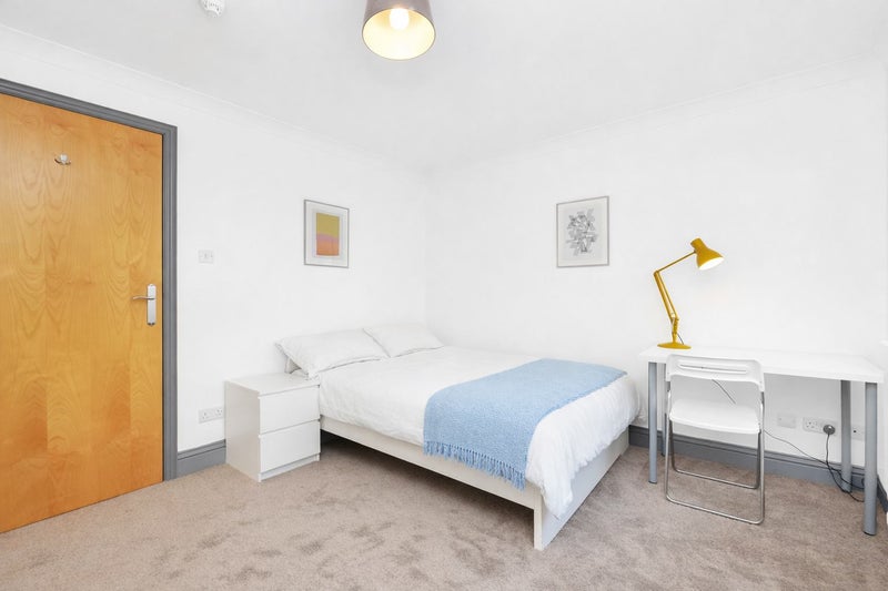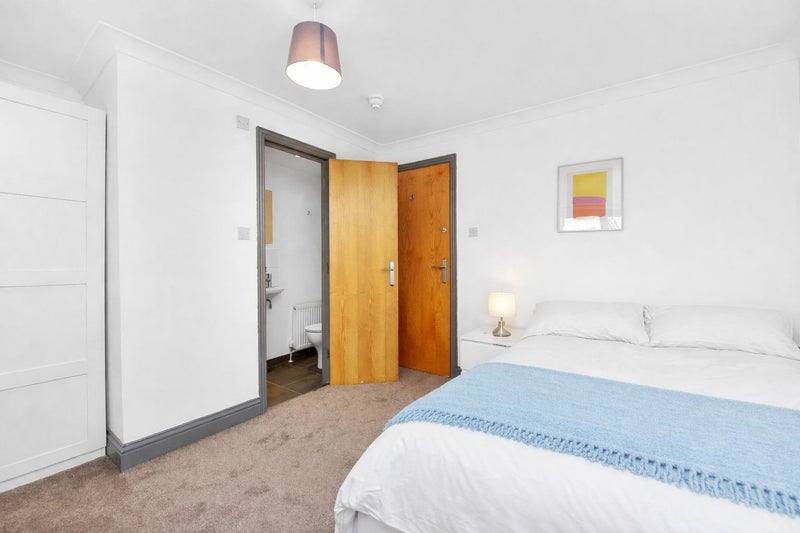Bright ensuite room with a large built in wardrobe & French doors in a clean modern co-living house on a quiet residential road in Holloway (N7 ).