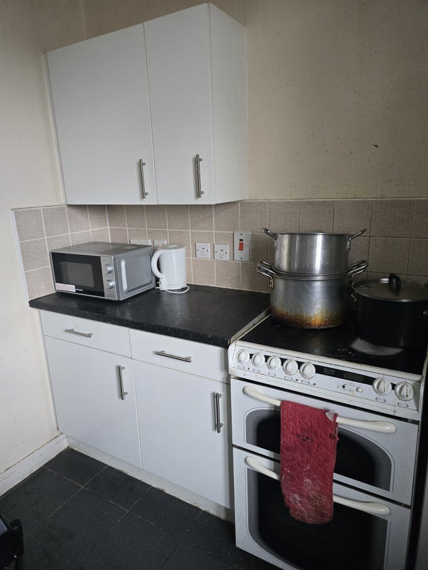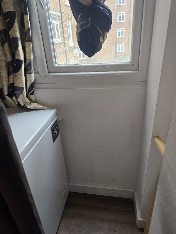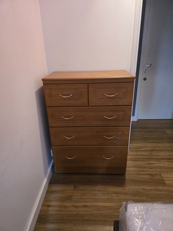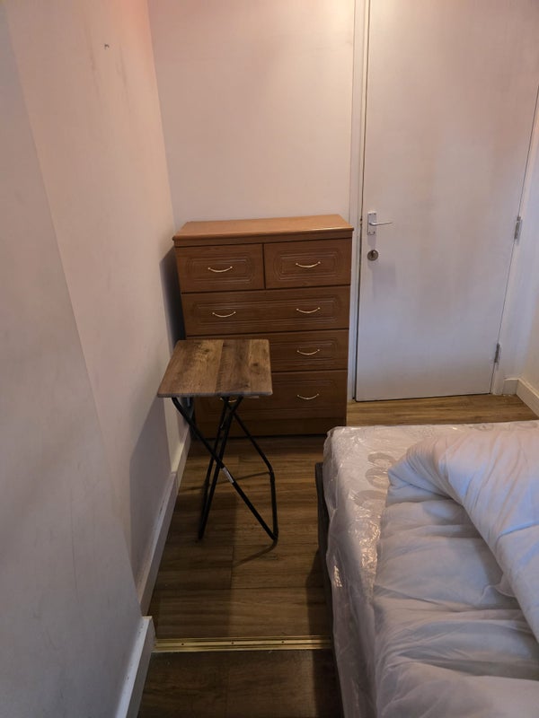 Furnished room with new bed small cupboards, foldable table also chest freezer for personal use