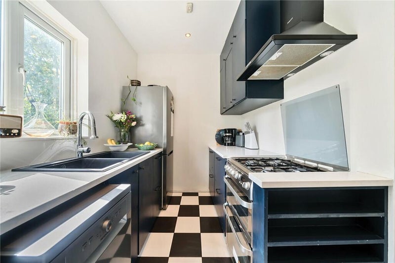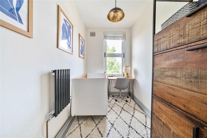 The property is an upstairs flat. There is a bright and airy living room, with views of London. There is on large size bedroom, with a king bed and lots of storage. A second bedroom which is currently used as an office and storage, a modern bathroom and kitchen with all amenities inc. dishwasher backing onto the park.
