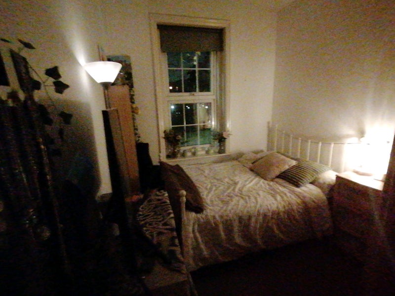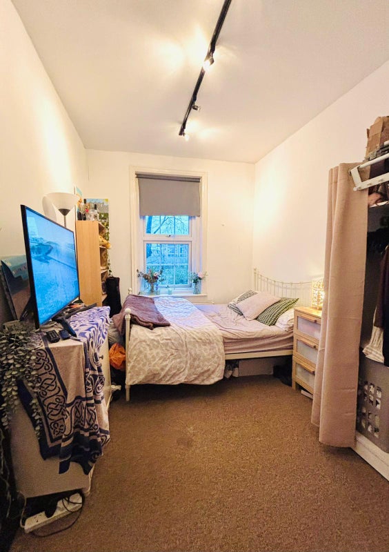 Fully furnished: double bed with large wardrobe with built in shelves, bookcase, desk, and chair. Great natural light. Plenty of storage, including space under the bed