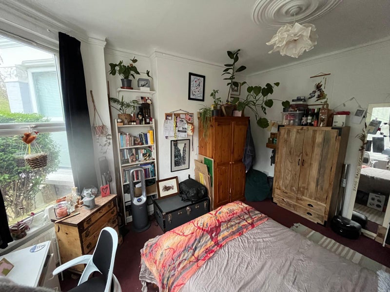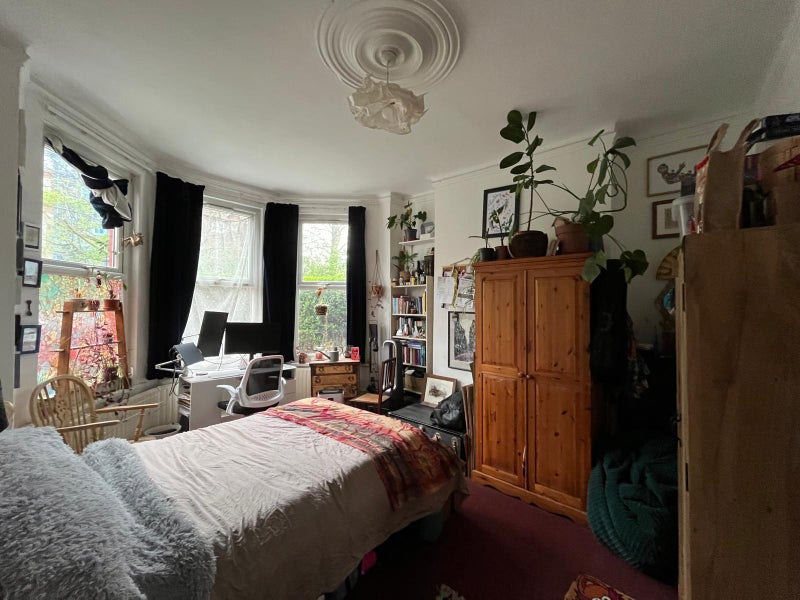 Ground floor, east facing double room, with beautiful bay window and furnished – double bed, desk, wardrobe, 2 bookcases, mirror, chest of drawers and shelves.