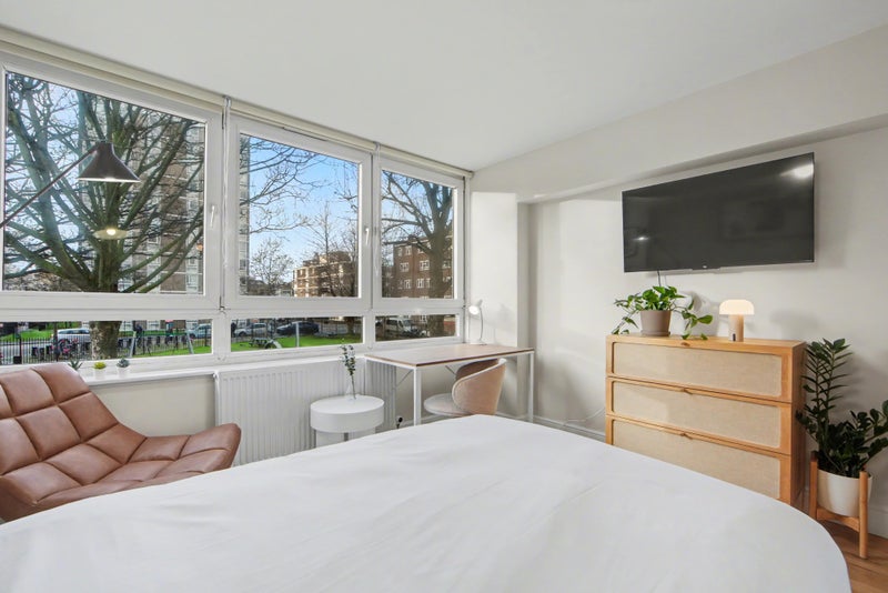 NEWLY REFURBED AND FURNISHED. Room with TV and desk. Share with 2 professionals; 1.5 bathroom and dining kitchen.