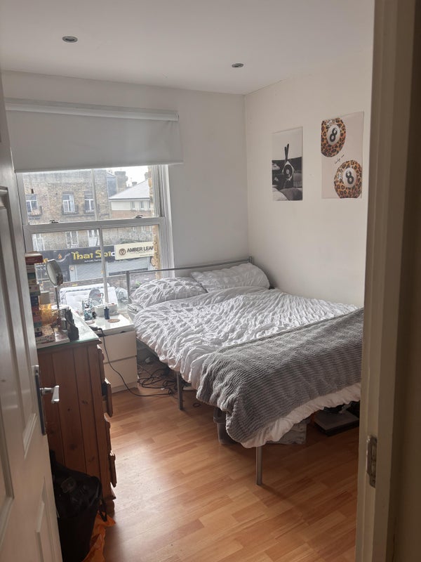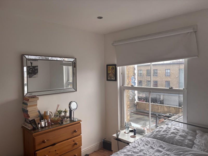 A bright, welcoming part furnished room (inc bed frame, mattress, wardrobe and chest of draws) is available in a two-bedroom flat in Hoxton, Hackney from the 22nd of May until the 19th of November, with potential to extend.