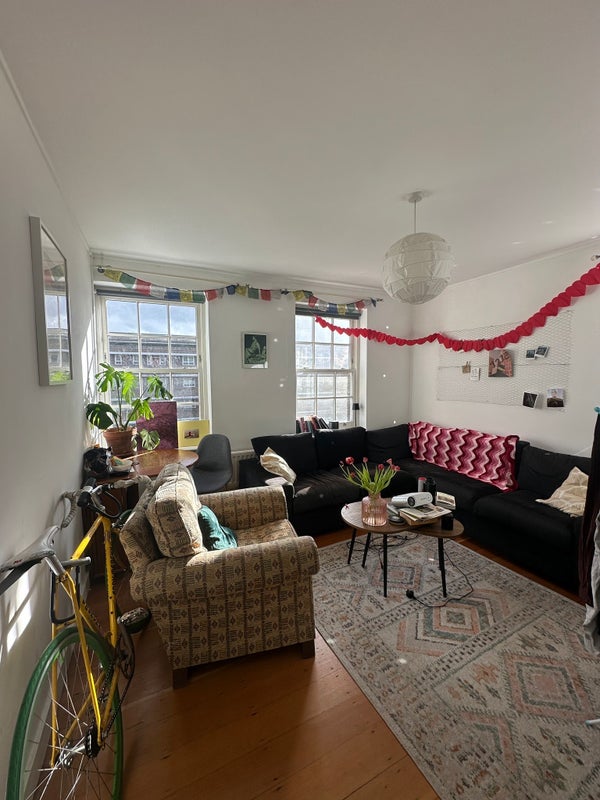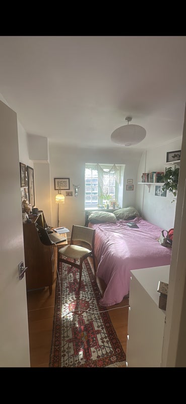 Room is furnished with a double bed, wardrobe, and dresser. It gets amazing south facing light. Flat is a gem on the corner of the building with lots of light. There’s a shared back garden with all the flats as well which is nice in the summer.
