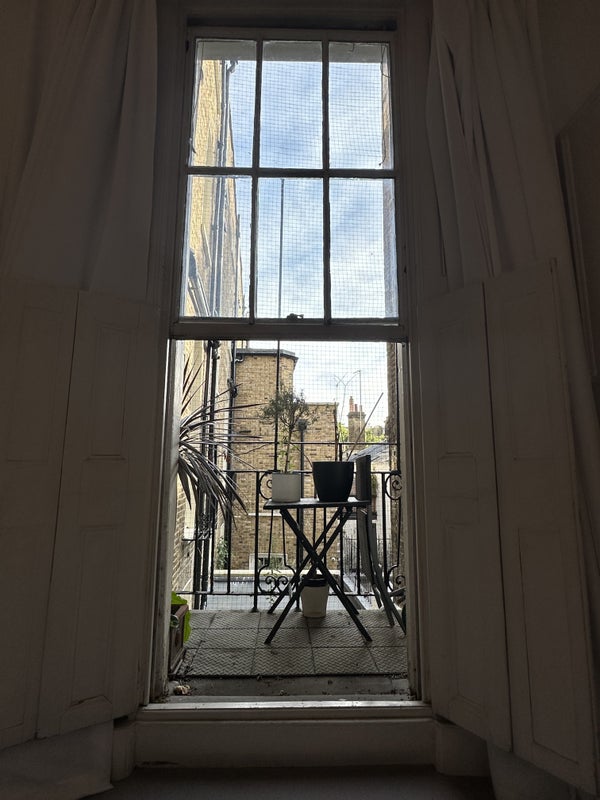 Share of a two-floor, two-bedroom flat; medium sized (20m2) bedroom with large sash window, high ceilings and a small terrace, South-facing and calm double bedroom, fully furnished with double bed and 2 cupboards.