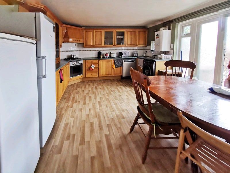 Kitchen is spacious and there is enough room for a shared dining space with dinning table and chairs. But there is no sofa or TV to share. There is also two shared small storage rooms which is not showing on the pictures.