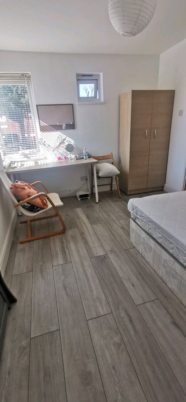 * Fully furnished room with a double bed, wardrobes, and chest of drawers. Desk and chairs.