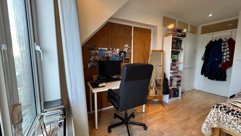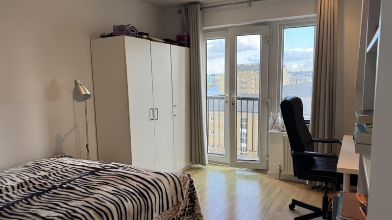 The room has lots of natural lighting and space to add your own personal furniture. It is located in a residential area that is lush with trees, a pond with ducks, and even cute wandering cats. It’s a 10 minutes’ walk from the DLR and situated a close distance from Canary Wharf (Jubilee, Elizabeth) and Greenwich.