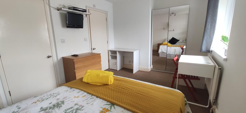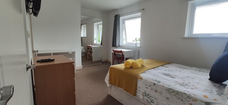 This en-suite room is fully furnished with a double bed, wardrobe, a chest of drawers, and a desk with a chair. As well as two bedside tables.