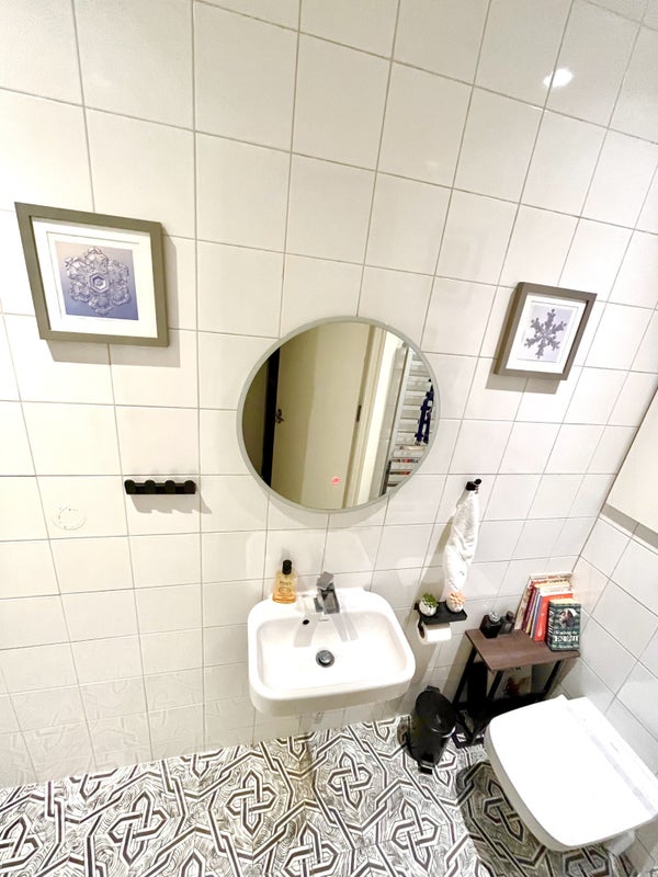 The bedroom is on the 1st floor of the house that has 3 levels and a total internal space of about 230 sq. m. so there is plenty of space to move very comfortably around the house. Home working is easy as the house has fast broadband and there is a large desk in your bedroom. The kitchen is very large with 2 sinks. The main dining table is facing the back garden and one can look at squirrels coming up from time to time, and you can also use the dining table in the kitchen overlooking the front garden. You would have private usage of a modern bathroom with Italian style shower on the ground floor and guests would use the downstairs toilet.