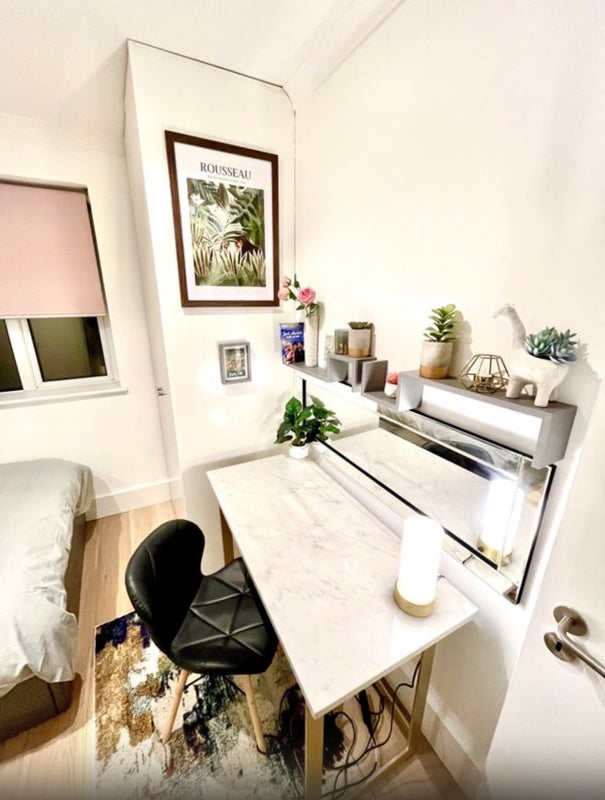The room is furnished and it has a massive wardrobes, mirrors, with extra storage under the bed, as well as a desk with chair and 2 separate charging points for phones/computers.