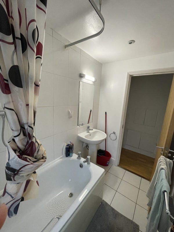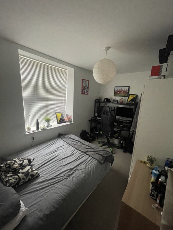 A spacious room with space for a big desk, wardrobe, draws and a double bed.