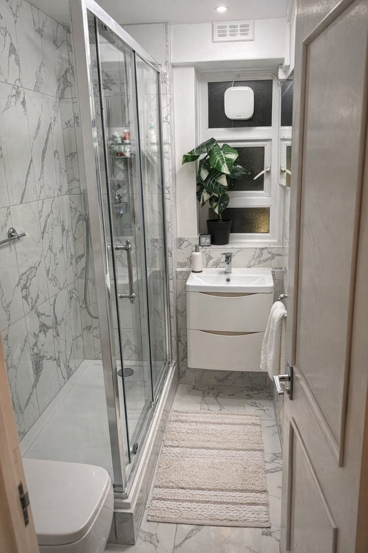 The property features a modern kitchen with ample storage, a high-spec marble-effect bathroom with walk-in glass shower, and a charming private balcony perfect for relaxing or enjoying fresh air.