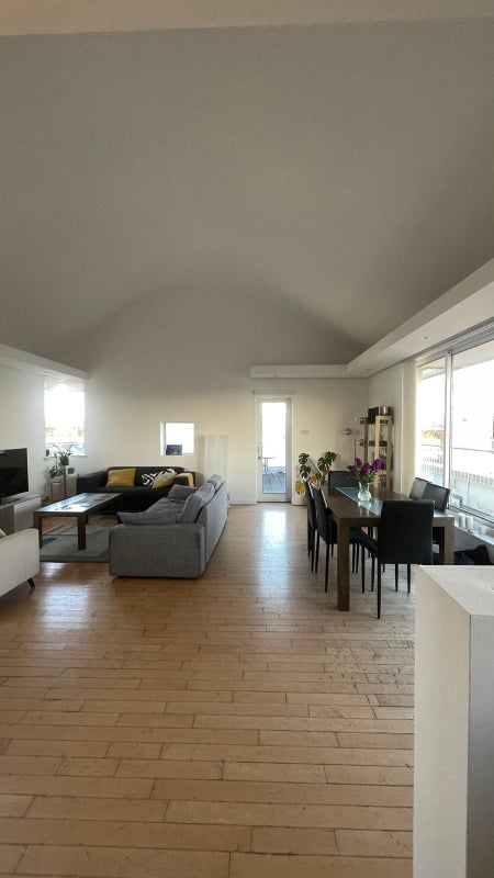 The flat has a spacious open-plan living room and kitchen, plus great outdoor space including a large roof terrace.