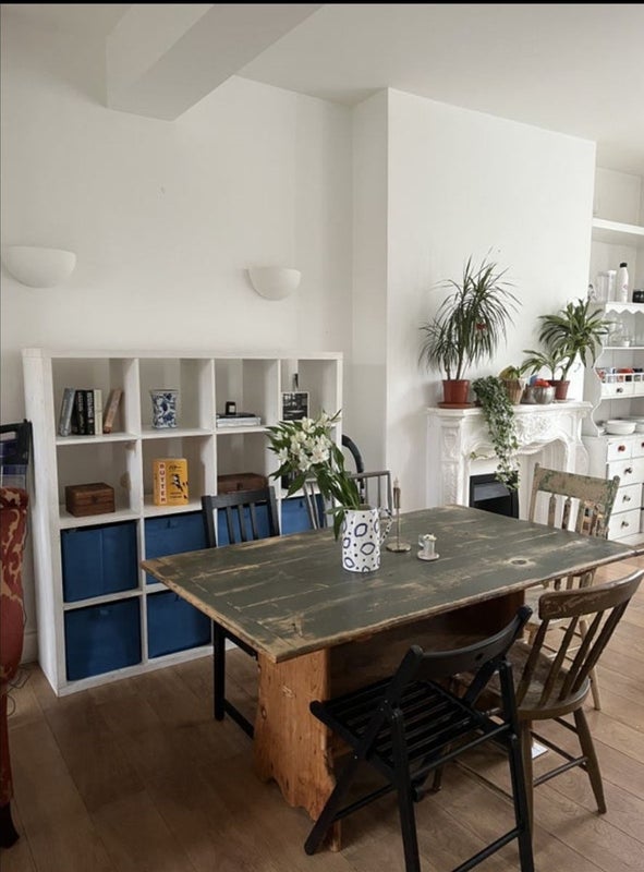 The flat is split across 3 and a half-ish floors and includes an outdoor terrace (not pictured) and open plan living room/dining room/kitchen. It has a lot of charm and benefits from getting plenty of sunlight throughout the day. There are nooks and crannies dotted throughout the flat for extra storage if needed, and space for a bike inside the entrance.