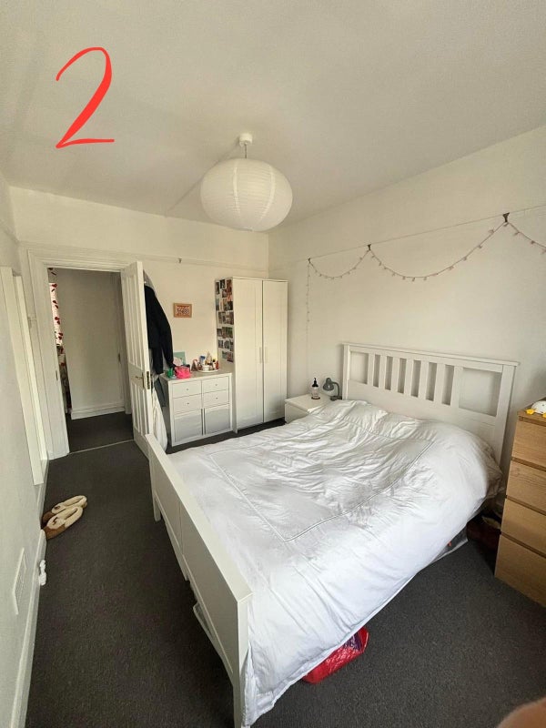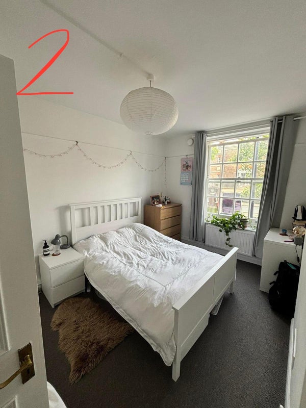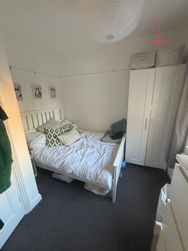 Very spacious bedroom furnished with double bed, bedside table, wardrobe, chest of drawers (option to buy off current flatmate), mirror, two kallex storage units (one with drawers). Ideal for a WFH setup.