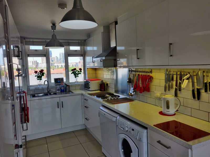The double room has all new furniture. A double bed, side table, chest of drawers, large mirrored built in double wardrobe with PIR lighting and of course the window has a blackout blind, venetian blind and curtains. The flat is smart and every flat light bulb can be one of 16 million colours which can be controlled by voice or mobile app as well as the control of zonal music and televisions.