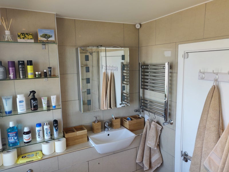 The bathroom has a full-size bathtub/strong shower. But the best feature is 2 dual fuel heated towel rails. No one should have to use a cold damp towel. Yes, when you wake your towel will be toasty warm. The mirror is heated of course; who has time for fogged up mirrors?