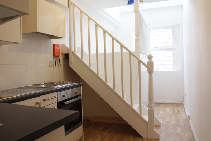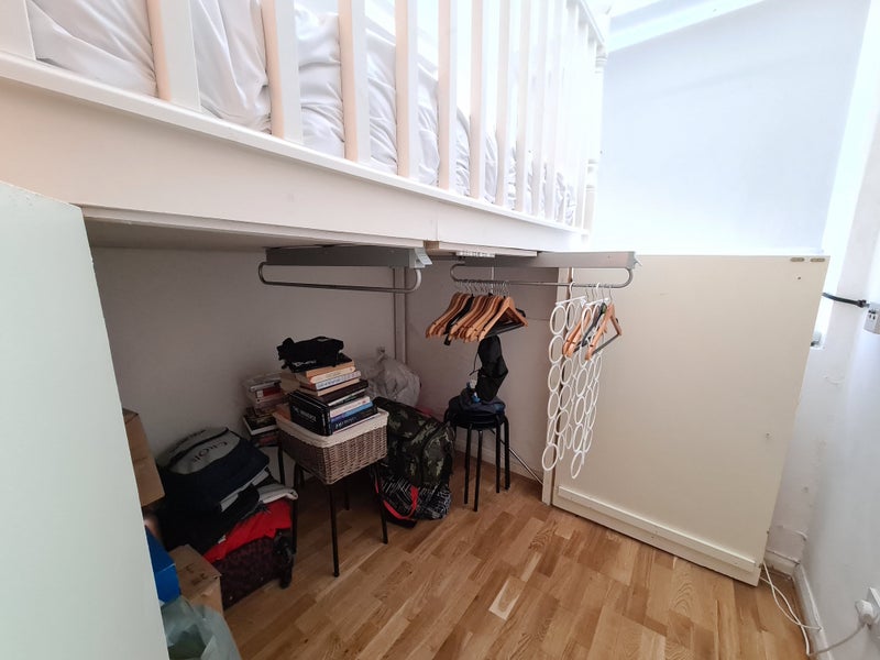The flat contains gallery bed with large storage space, kitchen with hob and oven and separate bathroom. No shared facility, the bathroom is private.