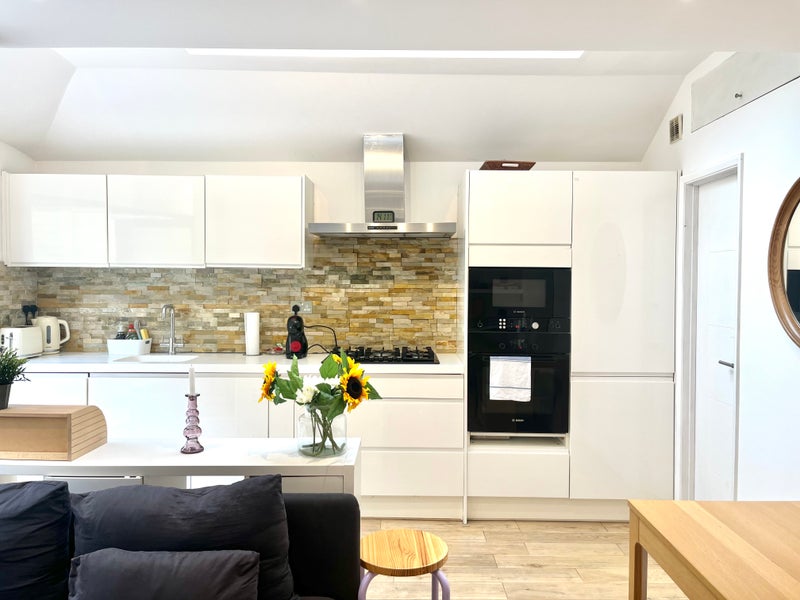 Step into a bright open-plan living area with plenty of natural light, featuring a comfortable sofa and dining space — ideal for both socializing and unwinding. The sleek, fully equipped kitchen includes everything you need for a comfortable stay, whether you’re cooking dinner or just enjoying your morning coffee.
