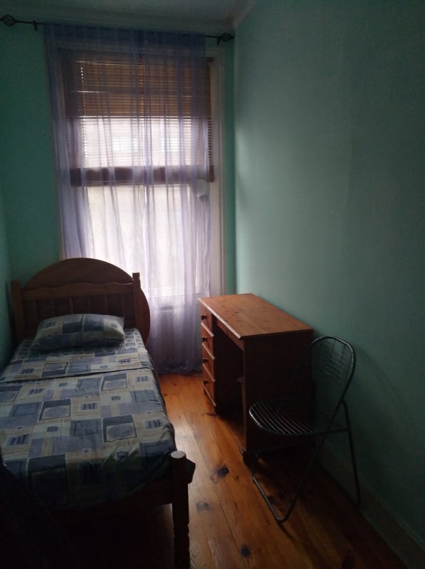 1) Single bright room with built in wardrobe, wood floor, single bed, single desk and chair, table available.