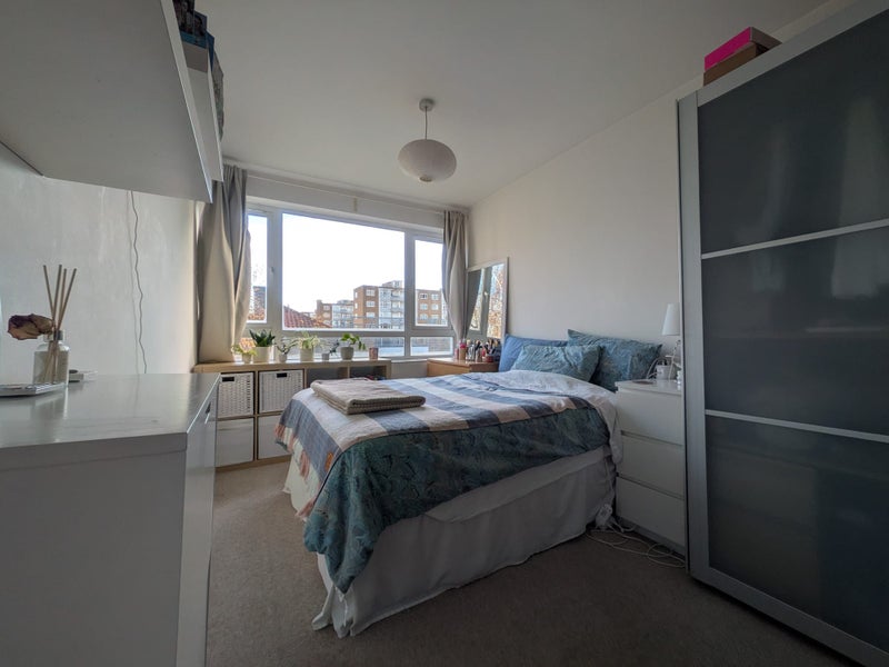 The room is a bright double bedroom, furnished with a good bed, storage and wardrobe space.