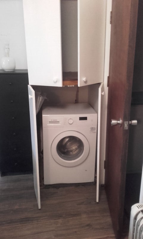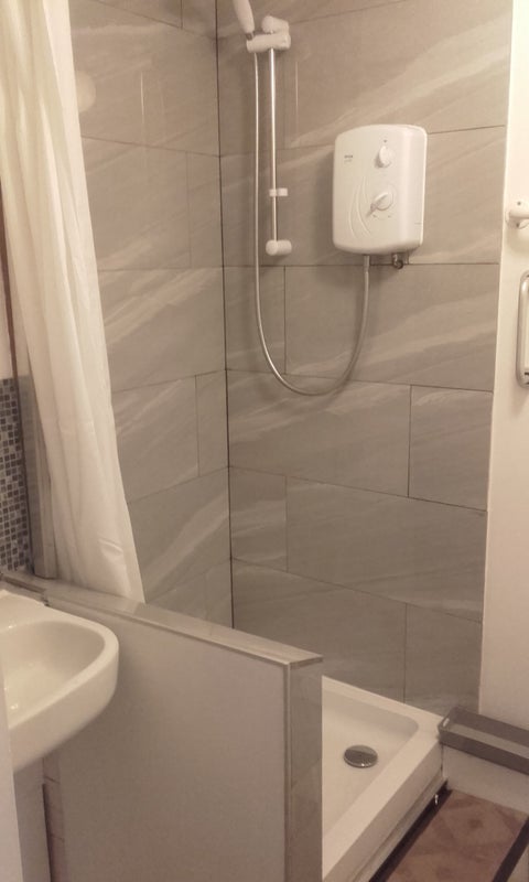 Shower room. Wooden floors.