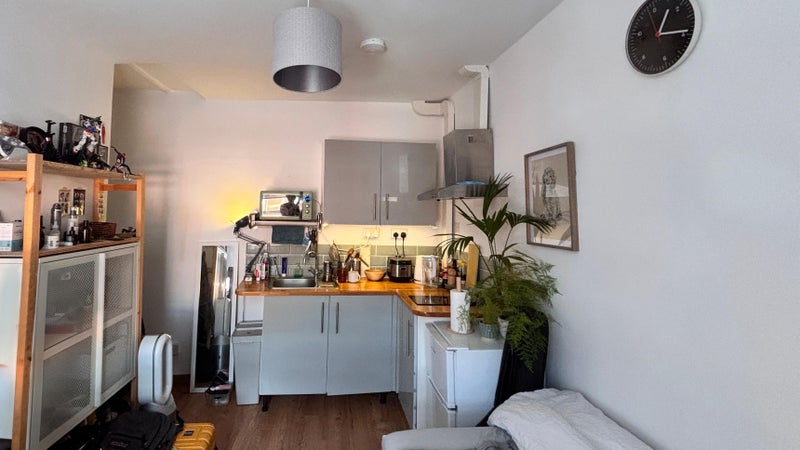 Presenting this modern double studio located in the Kentish Town area, which has just been refurbished. This studio is suitable for professionals or students. It is available for rent, with a minimum contract of six months. The location is highly convenient, directly opposite the Kentish Town Sports Centre and just a few minutes' walk from Kentish Town West overground station (3 minutes), Kentish Town underground station (8 minutes), and Camden Town underground station (14 minutes). The surrounding area is filled with coffee shops, cafes, restaurants, and various shops, making it an ideal place to live. This cosy studio apartment is designed to maximise space, featuring a single bed that can be changed to a double by request. It also includes a wardrobe and shelving that complement the bed's design. The entire building has laminate flooring, and access to both the building and studio is secured with a digital lock. The kitchenette is equipped with a fridge/freezer, toaster, kettle, electric hob, and microwave, all complemented by a solid wood worktop and ample storage space. It includes a bathroom with a toilet, basin, and shower, which can be shared with one person or is available as an en-suite. All windows are double-glazed. All bills are included in the rent (electricity, gas, water, broadband, and council tax). This studio is available for viewings now, so please schedule a visit soon.