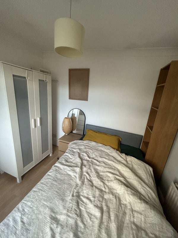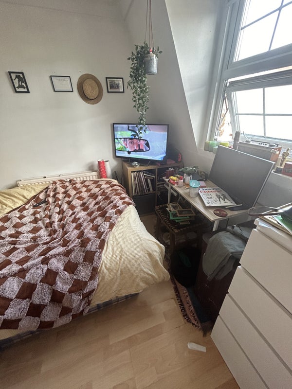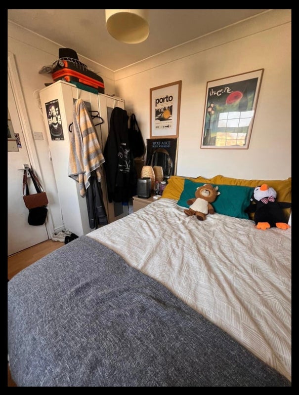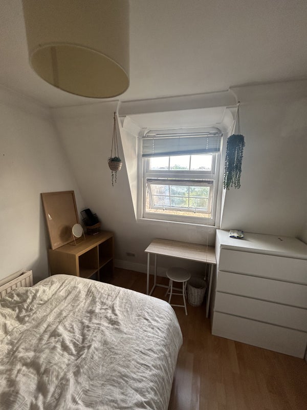 The room is a double bedroom, top floor facing away from the road, and the bed, desk, wardrobe, bookshelves and chest of drawers are all included. I have worked from home in this room in the past comfortably. There is also a large amount of shared storage across the flat which is communal.