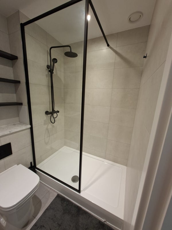 * Walk-in shower with black framed glass