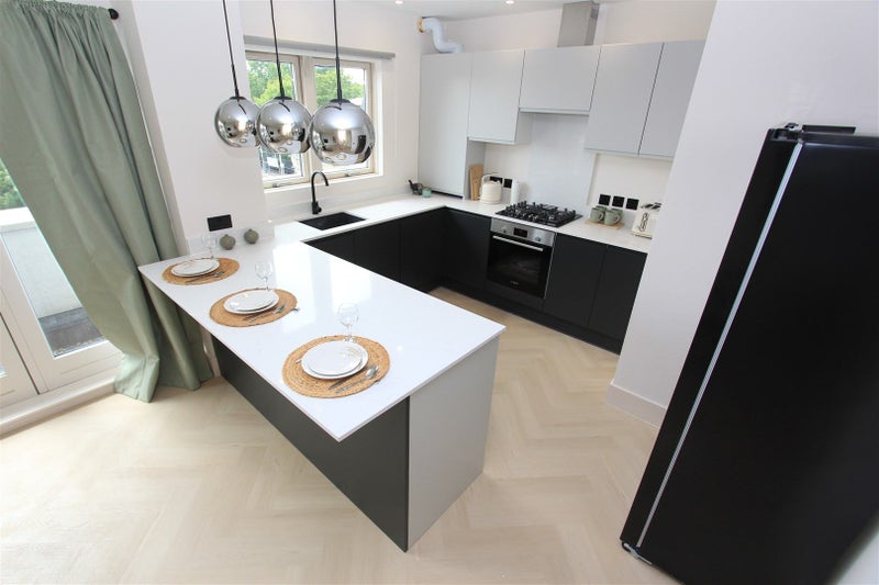 Wood flooring, white painted walls, Quartz splash back wall, spotlights and hanging feature lights, American style Candy fridge freezer, Bosch 4-burner gas hob & oven, extractor hood, window blind, sink, Quartz worktops, integrated boiler cupboard, 3-wall units / 8 base units / 3 drawers