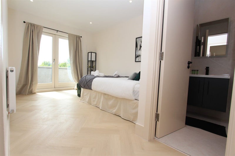 Wood flooring, white painted walls, spotlights, radiator, double bed, curtains, glass door to wrap around balcony