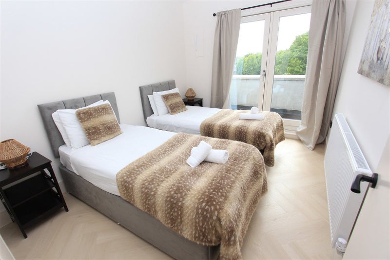 Wood flooring, white painted walls, spotlights, radiator, 2 single bed, 2 bedside tables, curtains, glass door to balcony