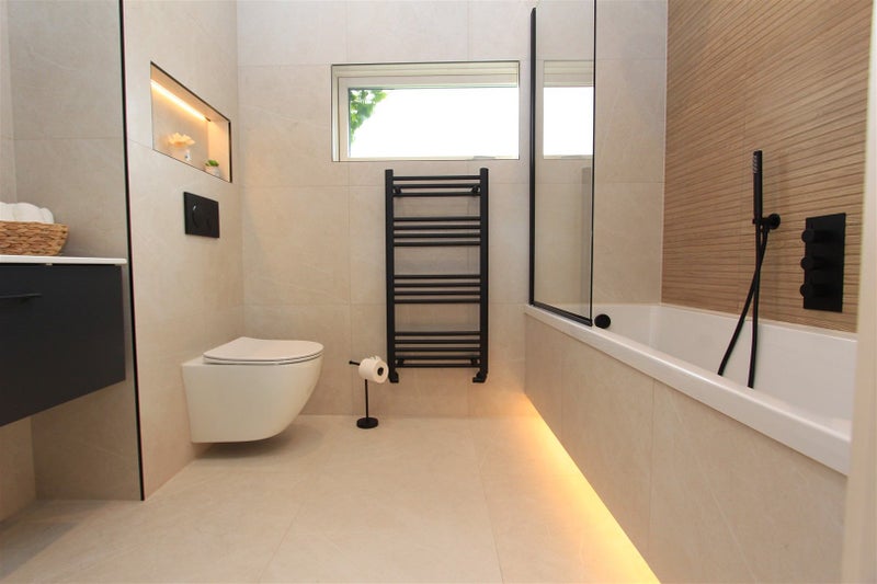 Cream floor & wall tiles, spotlights, WC, towel radiator, wall mirror, bath with shower-screen and rain showerhead, sink with drawer underneath